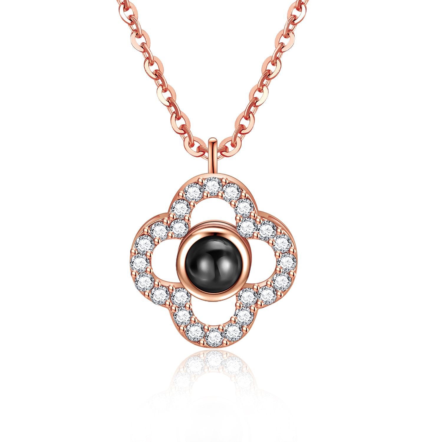 Delicately shaped like a blooming four-leaf flower, this elegant necklace symbolizes love, luck, and cherished memories. At the heart of the pendant lies a hidden micro-engraved photo—visible by looking inside or shining a light through the black stone to project it onto a flat surface.
